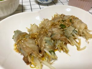 - フライパンをペーパーで拭き、ごま油大さじ1/2を足して、豚肉を炒める。